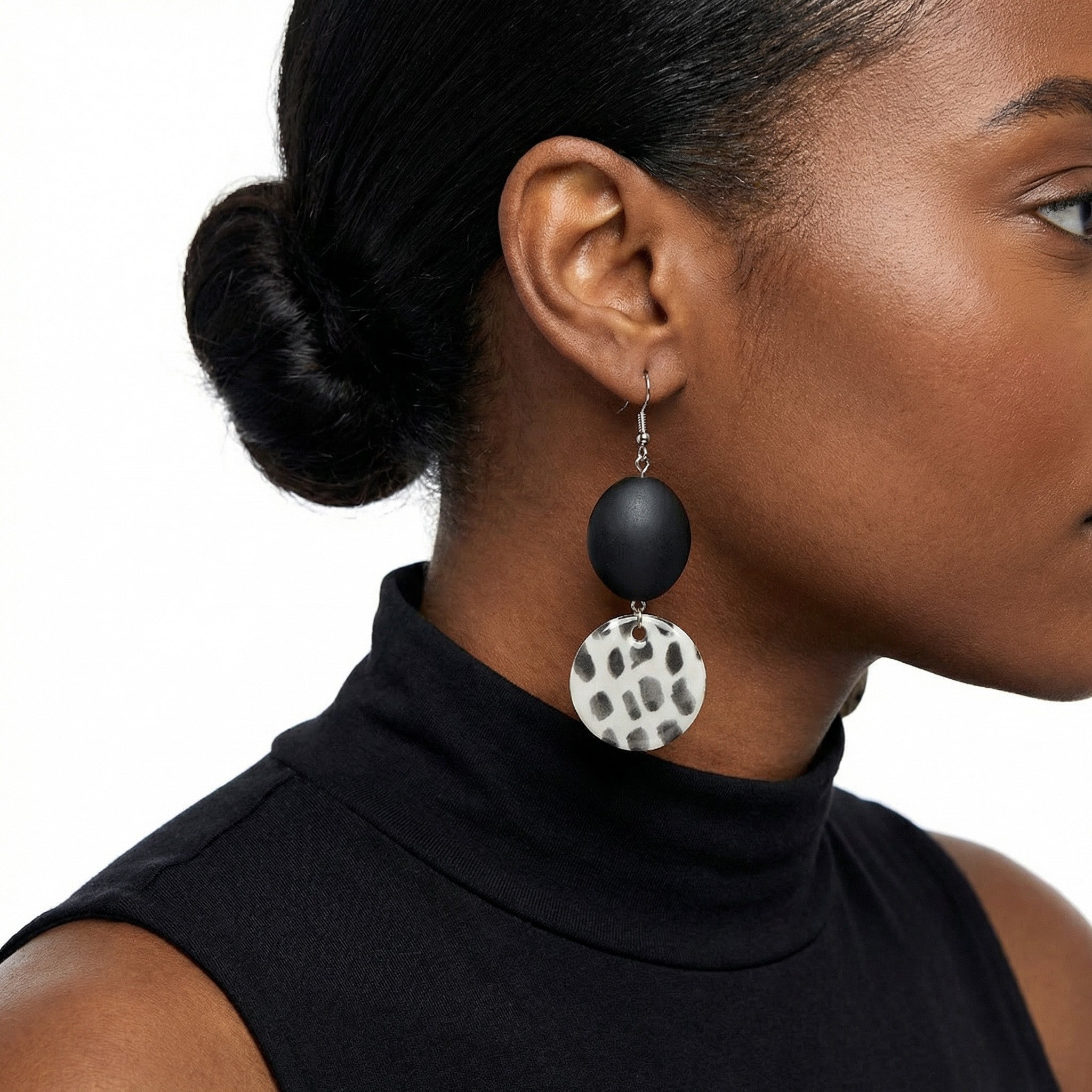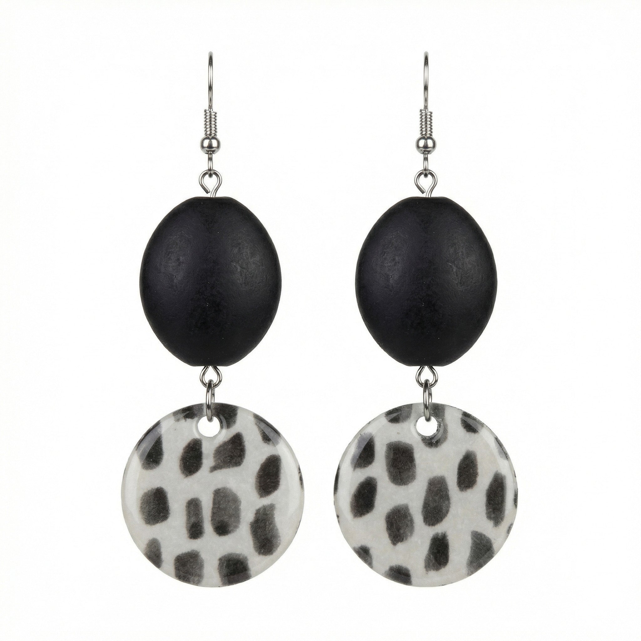 Make a bold statement with these eye-catching two-tier earrings. A smooth matte black bead sits above a playful dalmatian-spotted disc, creating a sophisticated black-and-white palette with a fun twist. The contrast between the solid black and the organic spotted pattern adds visual depth and interest. Perfect for animal print lovers who appreciate modern, statement-making accessories.