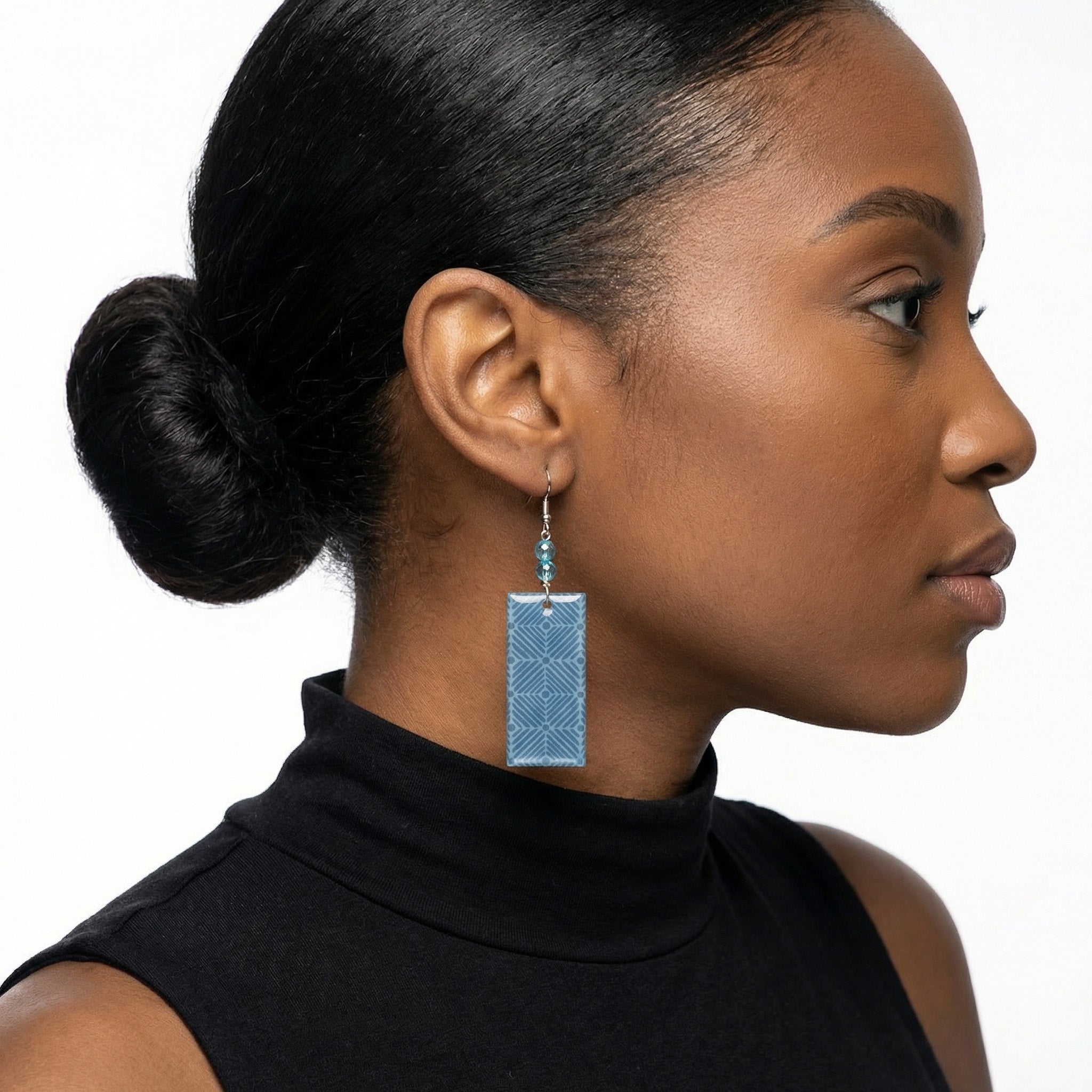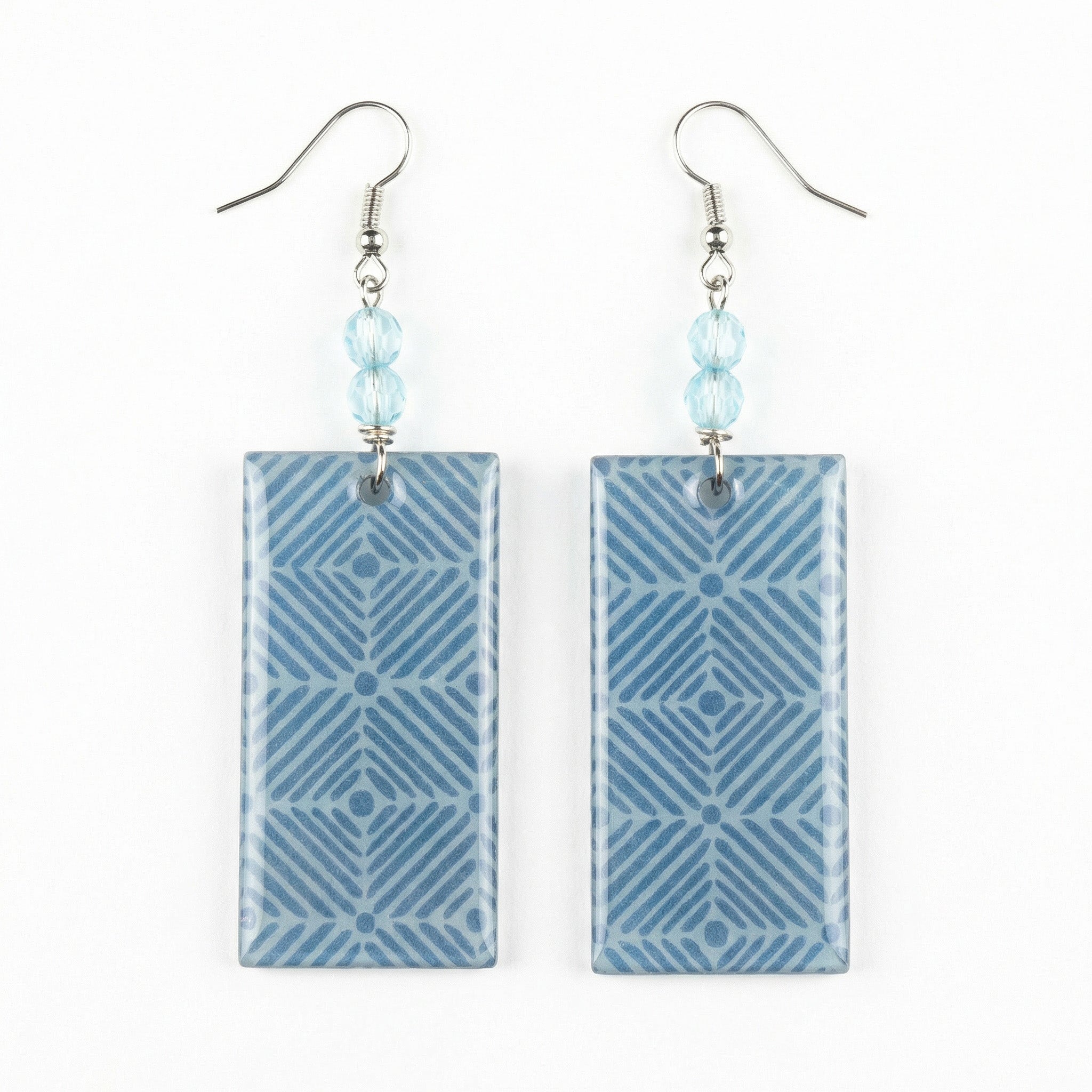 Clean lines and soothing colors define these elegant rectangular drops. A crisp geometric pattern in soft blue and white creates a modern, architectural feel, while translucent blue accent beads at the top add a pop of color. These versatile earrings transition effortlessly from office to evening.