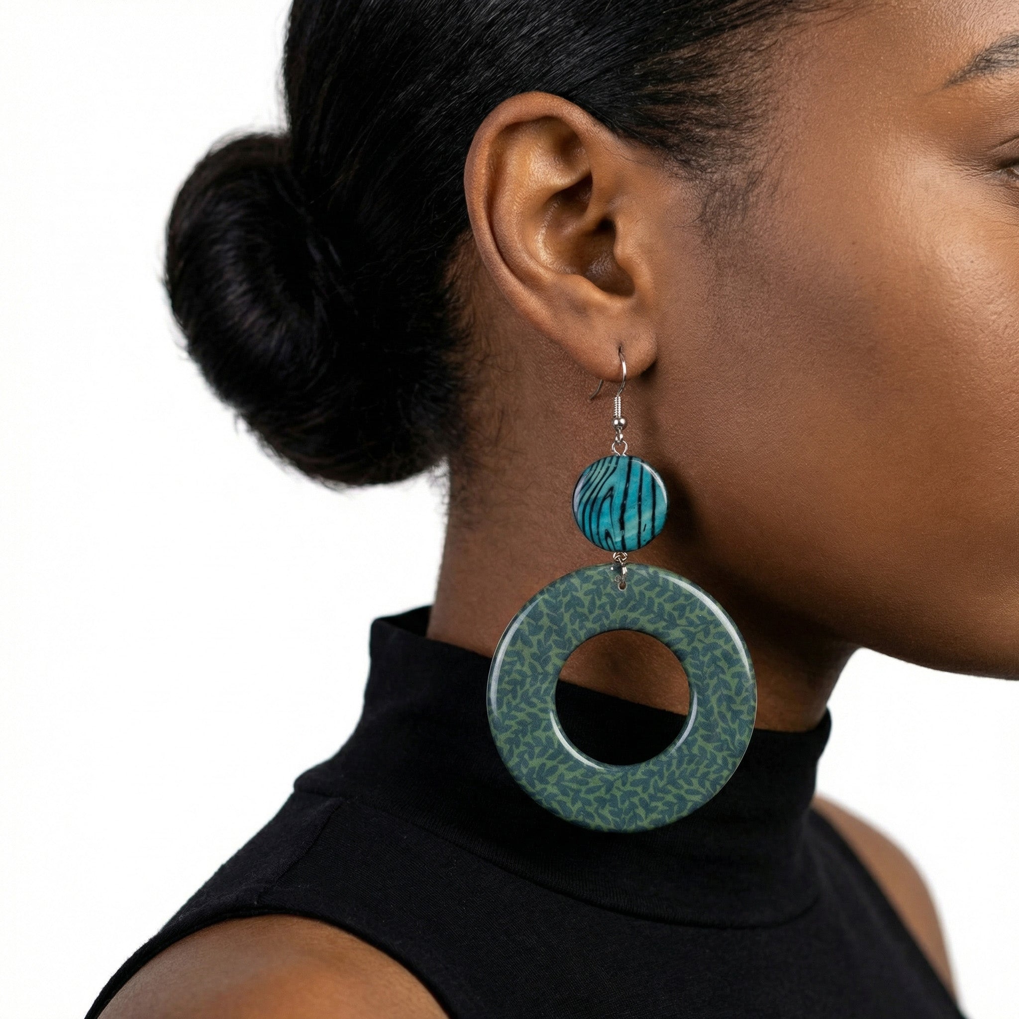 Bold and beautiful, these statement earrings combine geometric shapes in stunning jewel tones. A textured teal circular disc sits above a larger open-circle pendant in deep forest green with an organic pattern. The two-tier design creates eye-catching movement and dimension, while the coordinating color palette remains sophisticated and versatile.