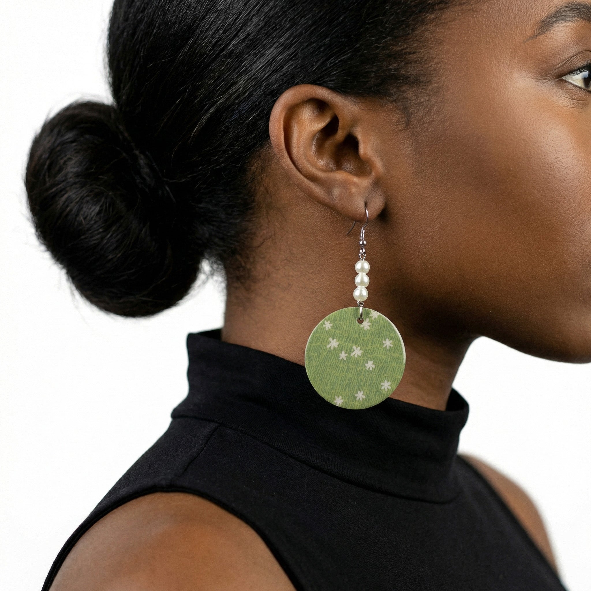 Delightfully charming, these circular drop earrings feature a sweet green background scattered with tiny white daisies. Three lustrous faux pearl beads add a touch of elegance above the botanical pendant, creating a perfect blend of whimsy and sophistication. These lightweight earrings bring a fresh, spring-garden feel to any ensemble.