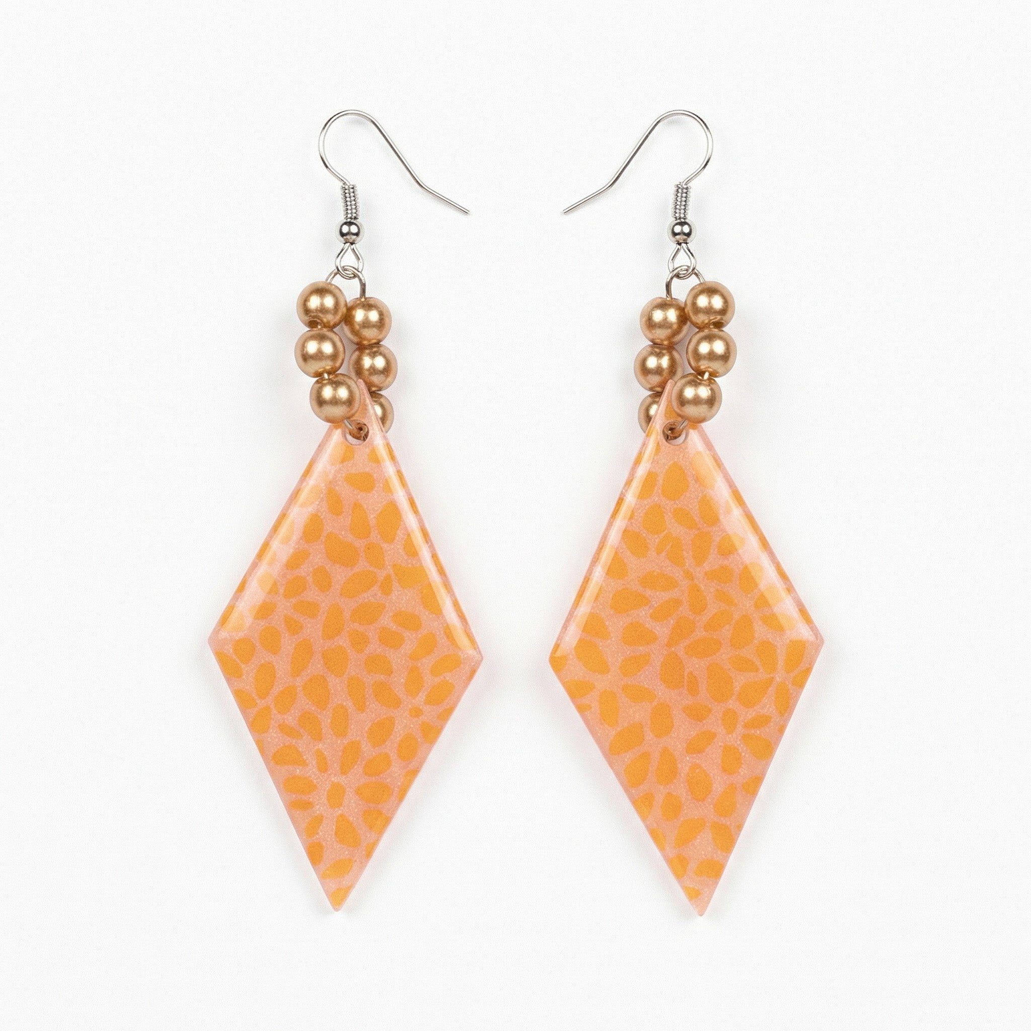 Elegant and feminine, these diamond-shaped dangles feature a delicate peach cheetah print pattern that catches the light beautifully. Clustered pearl-like beads at the top add texture and visual interest, while the geometric shape keeps the design modern and fresh. The soft peachy tones make these perfect for spring and summer wear.