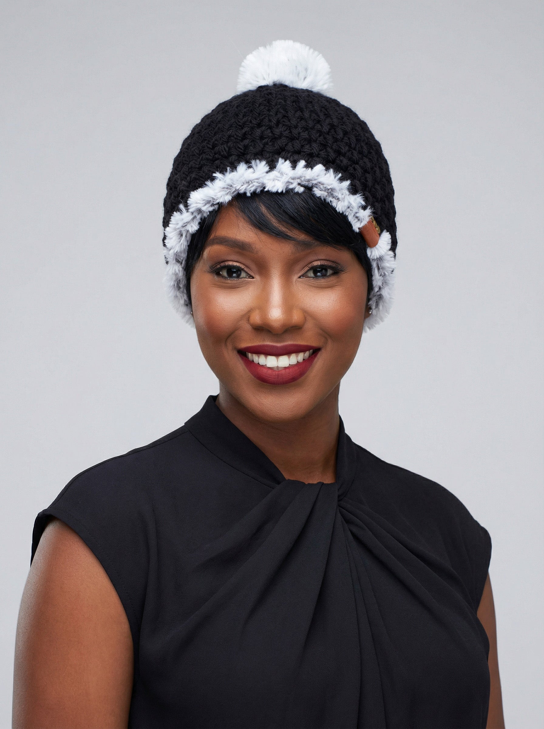 Step into a world where comfort meets chic. This chic satin lined winter hat with faux fur trim was designed not just to be warm and cozy, but to cherish your natural curls. With its sophisticated black hue complemented by the lavish white faux fur trim, this hat is a testament to style meeting function.